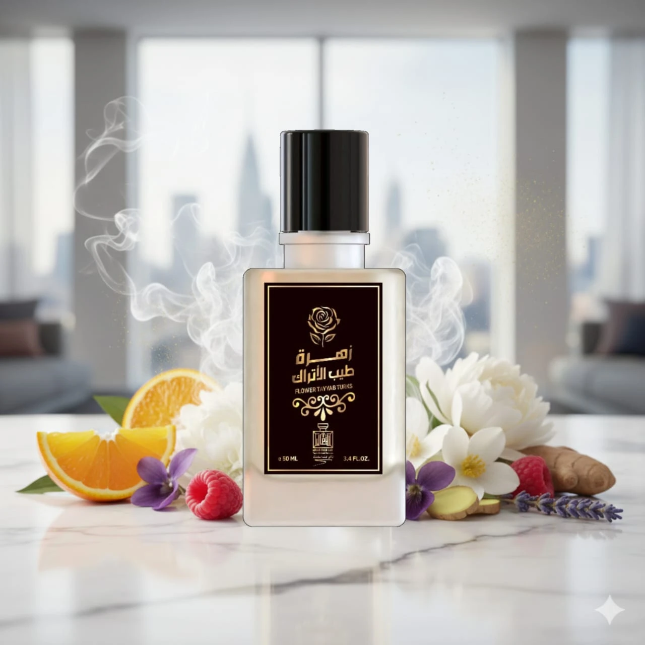 بفضل الله عطر زهرة طيب الأتراك عطر شرقي متوازن يناسب الشباب الراقي والفتيات الأنيقات، يمزج بين النفحات الفاكهية المنعشة والزهور الأنثوية مع قاعدة دافئة من المسك والعنبر وخشب الصندل